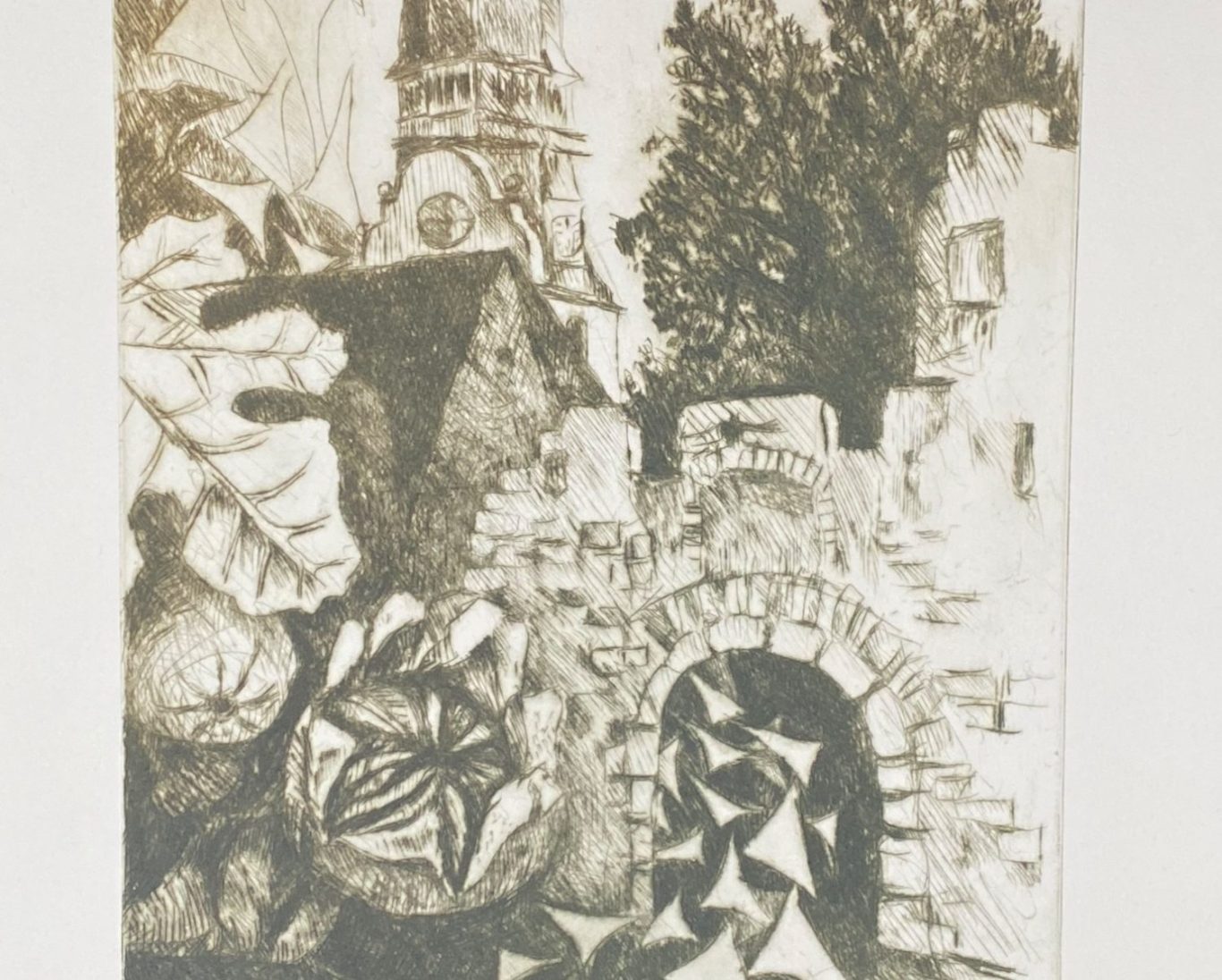 Die in Oppenheim lebende Künstlerin Carmen Stahlschmidt hat diese Radierung für den Orgelbauverein der Martinskirche Nierstein gestaltet. Deutlich erkennbar ist die Martinskirche mit Turm und Wehrmauer aus der Perspektive des Fronhofs. Abgebildet sind auch eine Feige und ein Granatapfel – Elemente des Bibelgartens. Ganz besonders fallen dem Betrachter Zierelemente ins Auge, die gleich einer Girlande durch das Bild ranken. Hiermit nimmt die Künstlerin Bezug auf die Verzierung der Orgel in der Martinskirche, die sogenannten Schleierbretter.
